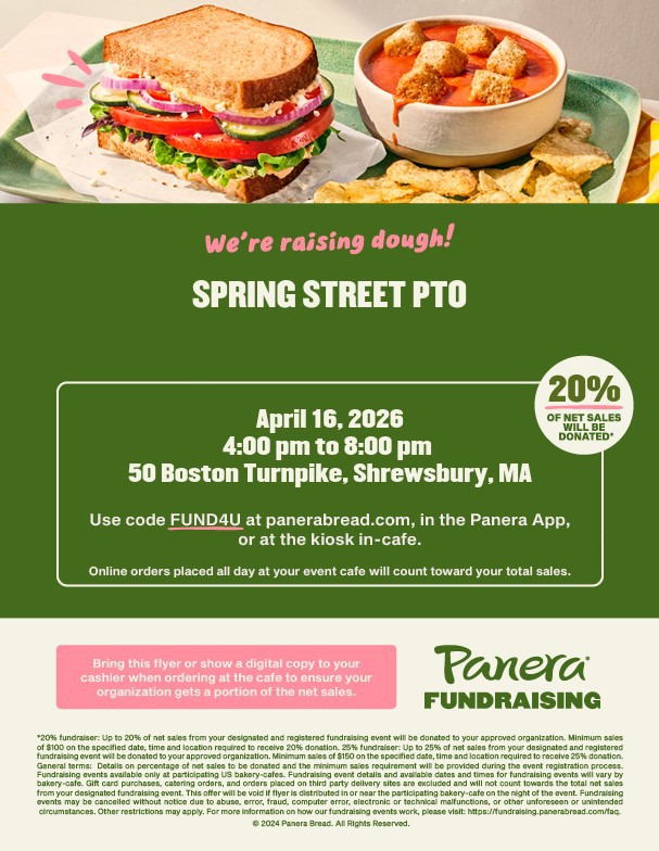 Please join us for our April dining fundraiser at Panera on April 16th! Eat at Panera using code FUND4U and a portion of the sales will go back to Spring Street.