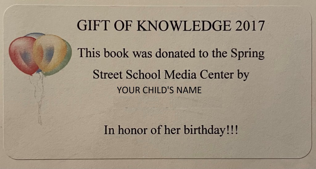 Celebrate your child’s birthday with a special ceremony that provides them with an opportunity to leave a legacy at the school for years to come. The event is held before school during which time students will choose from a selection of books, pre-purchased on behalf of the PTO, that will be personalized with a bookplate acknowledging their generosity. These books will be donated on their behalf to the Spring Street School library. Your child will be the first person to check out their selection from the library to take home. They will also receive breakfast and a goodie bag at the event.